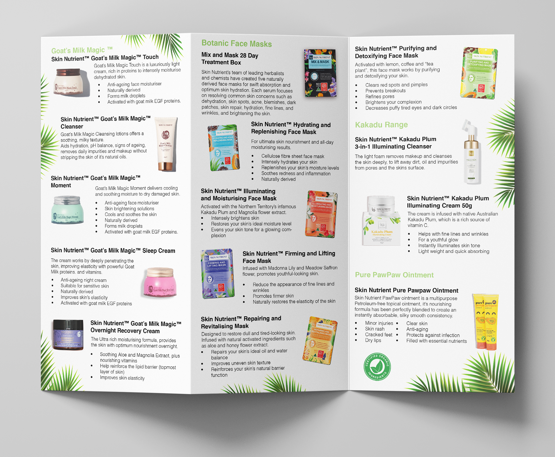 A multi-page brochure designed for Skin Nutrient Australia, showcasing their skincare ranges, key ingredients, and product benefits. The layout balances detailed product information with a fresh, natural aesthetic that reflects the brand’s focus on Australian-made, botanically inspired skincare.